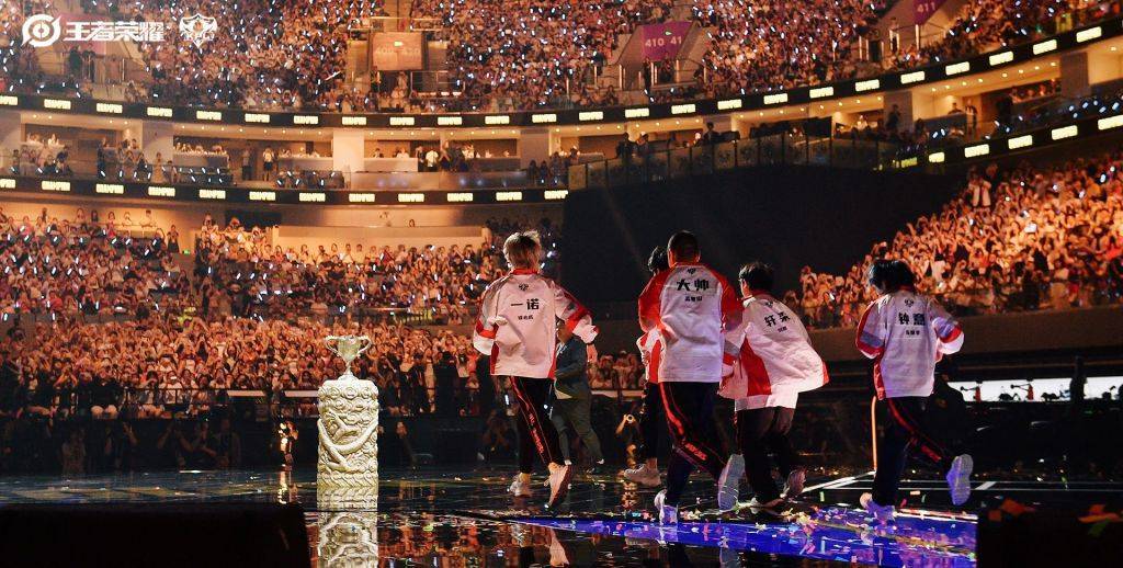 成都AG超玩会的队员们兴奋地冲向冠军奖杯。