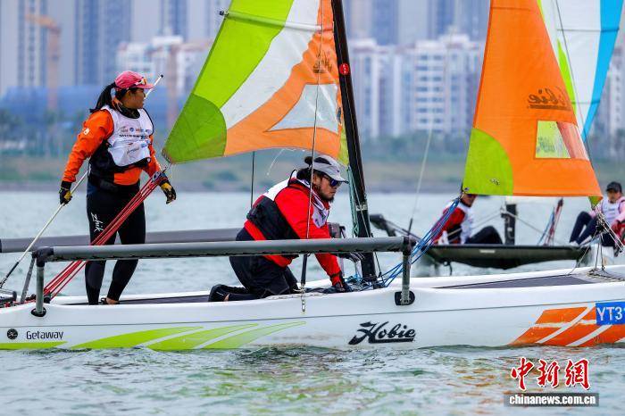 12月26日,2025海南“南渡江”国际帆船邀请赛在海口开赛,吸引国内外200余名选手参与多个组别的角逐。比赛覆盖家庭协作、专业竞技、青少年成长等多个维度,兼顾了赛事的专业性与全民参与性。图为参加Hobie Getaway组的选手在比赛中。中新社记者 骆云飞 摄